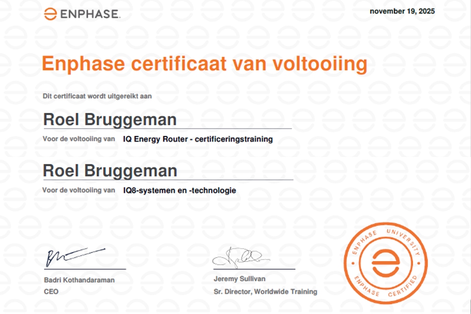 Roel Bruggeman heeft recent twee officiële trainingen succesvol afgerond via Enphase University, het kennisplatform van één van de meest innovatieve spelers in zonne-energie.