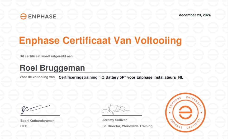 We zijn ontzettend trots om aan te kondigen dat we een nieuwe stap hebben gezet: we hebben de officiële cursus bij de Enphase Academy succesvol afgerond! Met deze certificering zijn we nu bevoegd om de Enphase 5P batterij niet alleen te verkopen, maar ook professioneel te installeren en direct in gebruik te stellen.